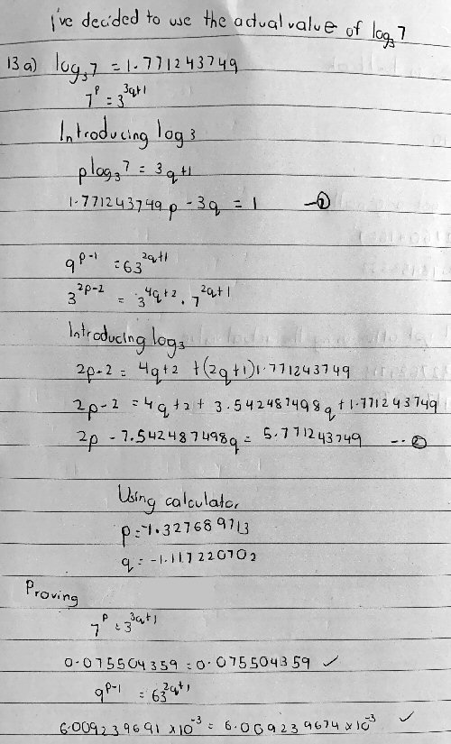 The funny thing is that one of my values doesn’t match the answers given. Which I find almost impossible, for how can I solve simultaneous equations and only get one of them right? So I decided to test the values of p and q I attained and as you said, one of the statements is pretty close to being correct while the other has a very high error. This frustrated me so I decided to prove the statements with the answers given to me that were supposed to be correct. That didn’t work out very well because the errors were in hundreds. So I concluded they were wrong. I finally decided to use the real value of the logarithm given in the question instead of the value given and after proving, I managed to get both sides of the equations equal.