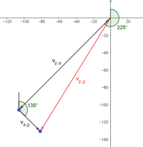 The bearing of \(v_{a,g}\) is opposite to the 315° angle specified, because the latter gives the direction from which the wind comes, which is opposite to the direction toward which it blows. So this is \(315-180=135°\).