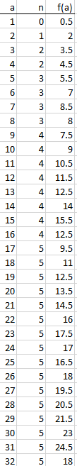 Putting this together, we have a piecewise function: $$\text{Let }n=\lceil\log_2(a)\rceil$$