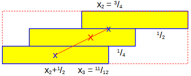 Measuring from the right edge of the top block, the center of mass of the top block (which I'll call x[1]) is 1/2 unit from the right, as I said. The center of mass of the next block down is 1/2 unit to the left of its right edge, which in turn is x[1] = 1/2 unit to the left of the right edge of the top block. This is 1/2 + 1/2 = 1 (as you can see in the second figure).