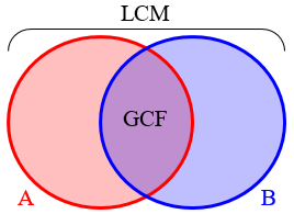 Each number (A and B) is the product of all the prime factors we’ll put into its circle; the LCM is the product of all of them, and the GCF is the product of just those in the overlap. If we multiply A and B together, we are multiplying all factors in the LCM, and those in the GCF a second time, which explains the formula.