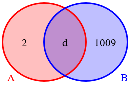 The LCM is the product of the GCD and the extra factors of A and B. (That is, \(m=hkd\).) Since \(m=2018d\). we know that \(hk=2018=2\cdot 1009\), so that, as before, \(h=2,k=1009\), or \(h=1,k=2018\). The former leads to this Venn diagram: