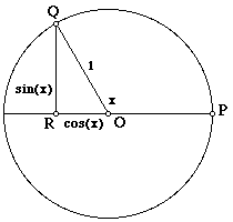 If angle x is 90°, then Q is at the top of the circle, and R is at the origin. The cosine is therefore 0; the “right triangle” is just a line segment.